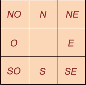 En este sentido hay que empezar por tener en cuenta que el Feng Shui utiliza básicamente las ocho direcciones posibles (N, NO, NE, S, SO, SE, E, O) correspondientes a los ocho triagramas del I-Ching. Para situar estas direcciones y clarificarlas con respecto a tu casa, se ha creado el llamado cuadrado mágico o cuadrícula Lo Shu, que te servirá de plantilla.