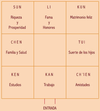 Para favorecer la buena consecución en nuestra vida de estas directrices o pautas para la felicidad han trazado un plano por donde pasa el Chi que activará cada campo para descubrir si en nuestra casa falta alguno de ellos o está a medias. Para ello necesitarás trazar el plano de tu casa lo mejor posible sobre el siguiente cuadrado de nueve casillas: